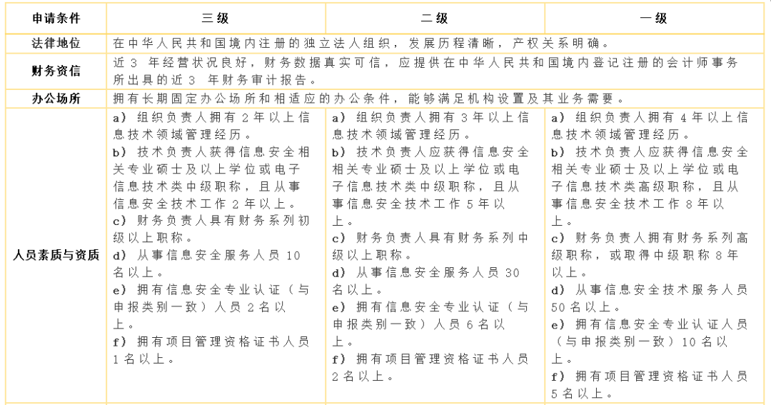 信息安全服務資質(zhì)級別分為一級、二級、三級,其中一級最高,三級最低。資質(zhì)級別是衡量服務提供者服務能力的尺度。