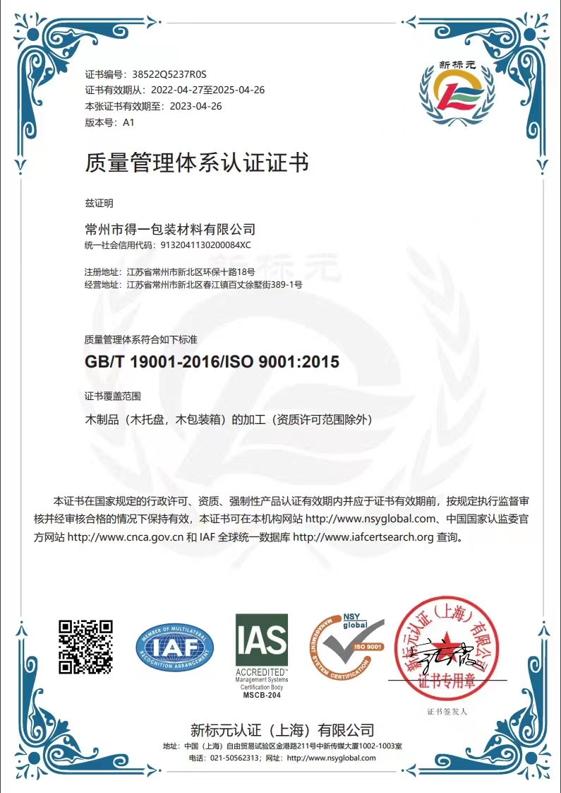 恭喜常州市得一包裝材料有限公司獲取ISO9000質(zhì)量管理體系證書