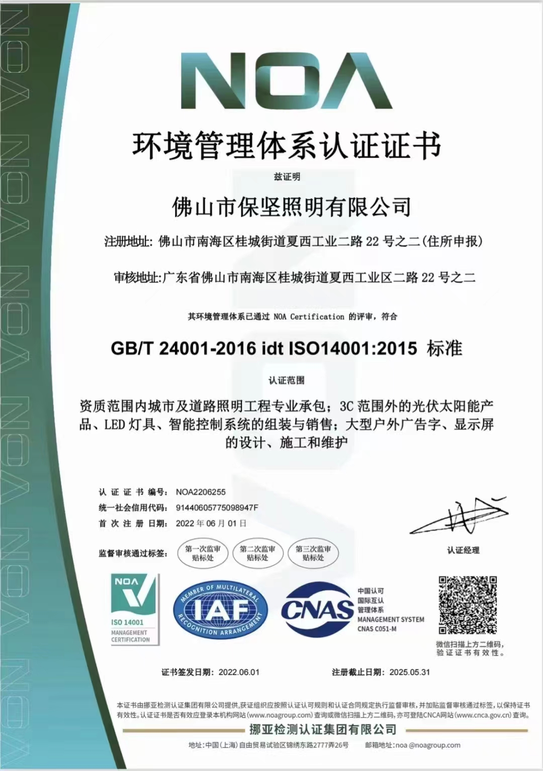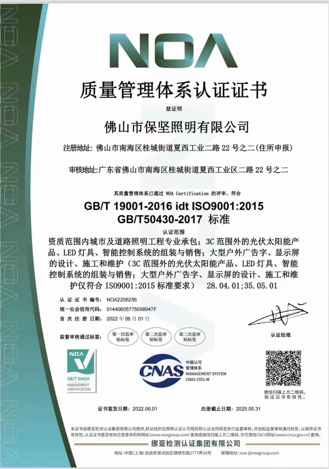 恭喜佛山市保堅照明有限公司獲得ISO三體系認證證書