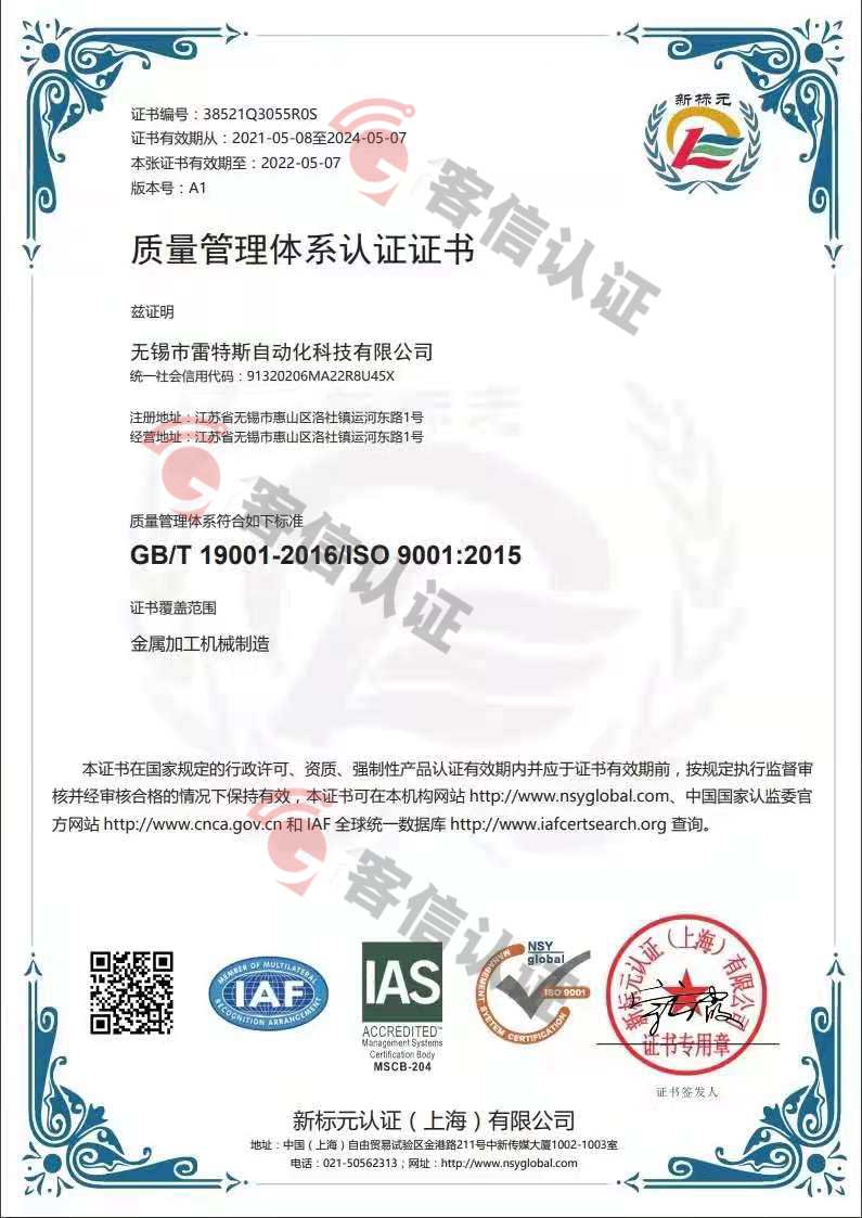 恭喜無錫市雷特斯自動化科技有限公司獲取ISO9000質(zhì)量管理體系證書
